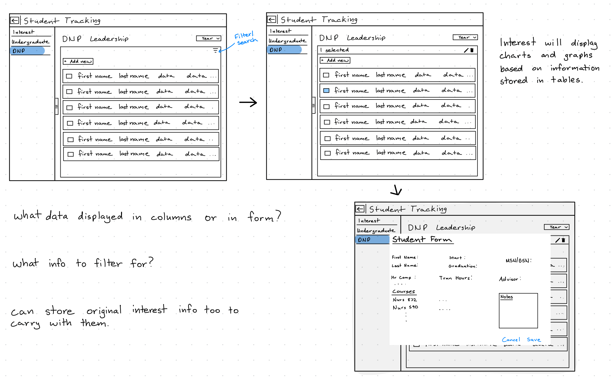 My orginal brainstorm and sketches for the student database