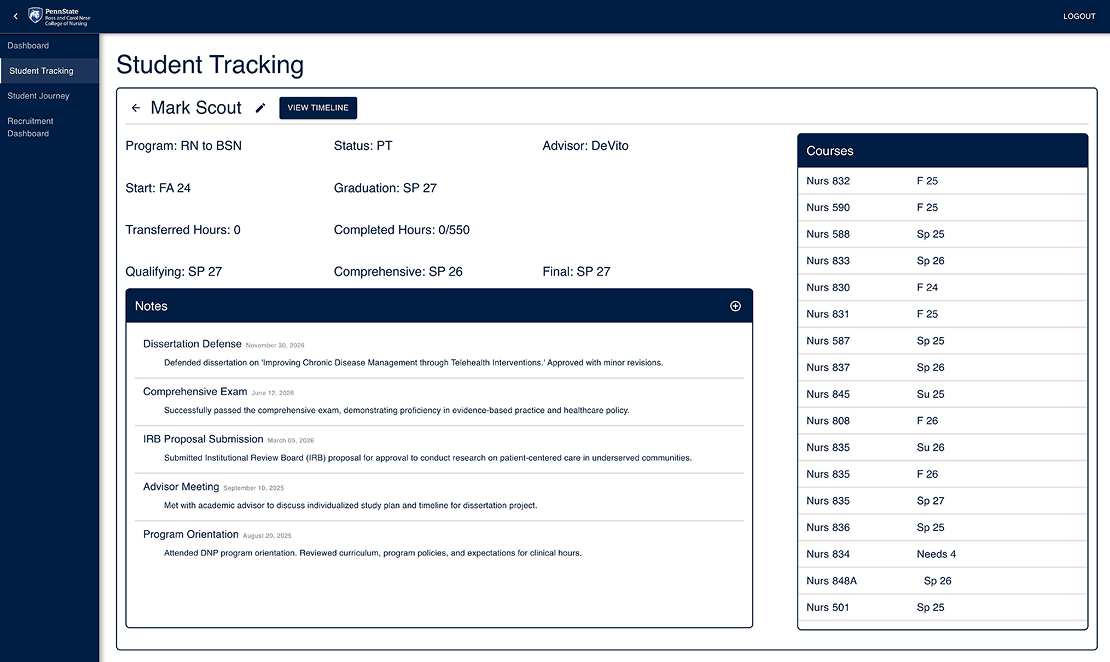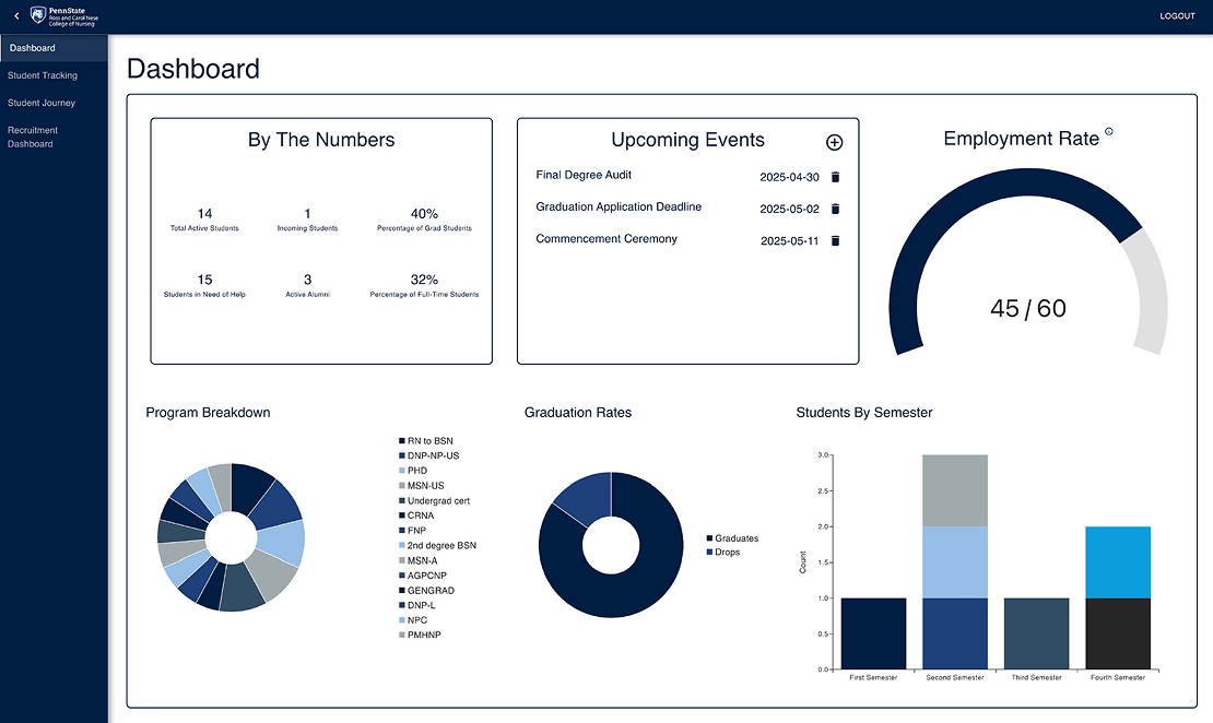 For my senior Capstone project, I co-led a team of seven to design a full-stack data management system for Penn State’s Center for Immersive Learning, replacing the outdated spreadsheets and Power BI dashboards used by the College of Nursing. At the time, Nese College of Nursing’s graduate program did not have a streamlined way of keeping track of their students. Each department tracked recruitment, enrollment, and student progress separately, which led to inefficiency and inconsistent records. Over four months, we developed a secure web application to meet our sponsors’ needs and concerns. I served as co-lead, lead designer, and frontend developer, contributing significantly to both the technical implementation and team coordination.