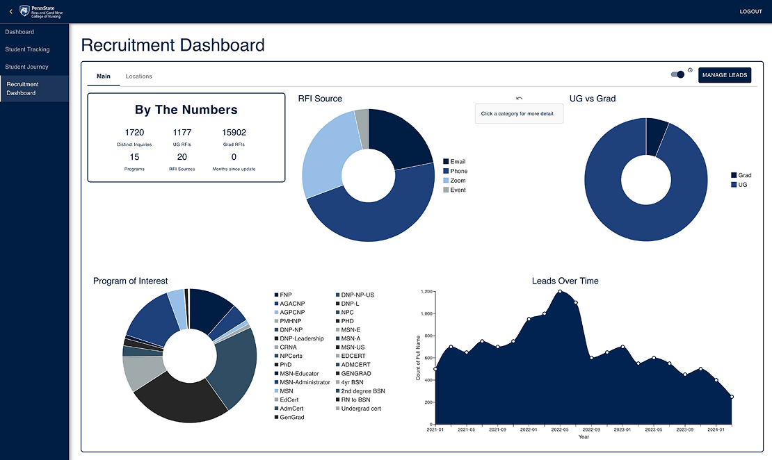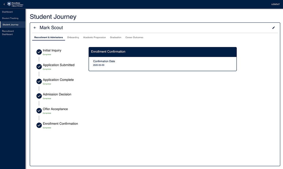 Our goal was to deliver a synchronized web application to connect student and recruitment data for administrators. Our deliverables were a modifiable and searchable database of students, reflecting their individual progress from recruitment to their first post-graduation job. Additionally, we were to display several up-to-date dashboards to quantify recruitment information and department statistics based on the information in the database. We built the front-end in React.js, using the Material UI and MUI X libraries for our components. The backend used a Django REST Framework connected to a MySQL database. A primary concern for our team was security, given the sensitive nature of student information. Therefore, we implemented Auth0 for secure administration-only sign-in. Additionally, we used sandbox data when temporarily hosting on AWS, while coordinating with Penn State IT for eventual campus server deployment.